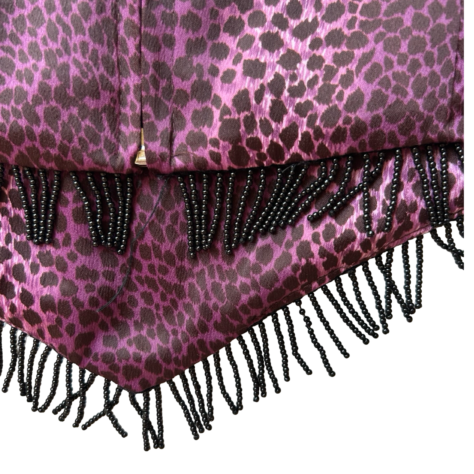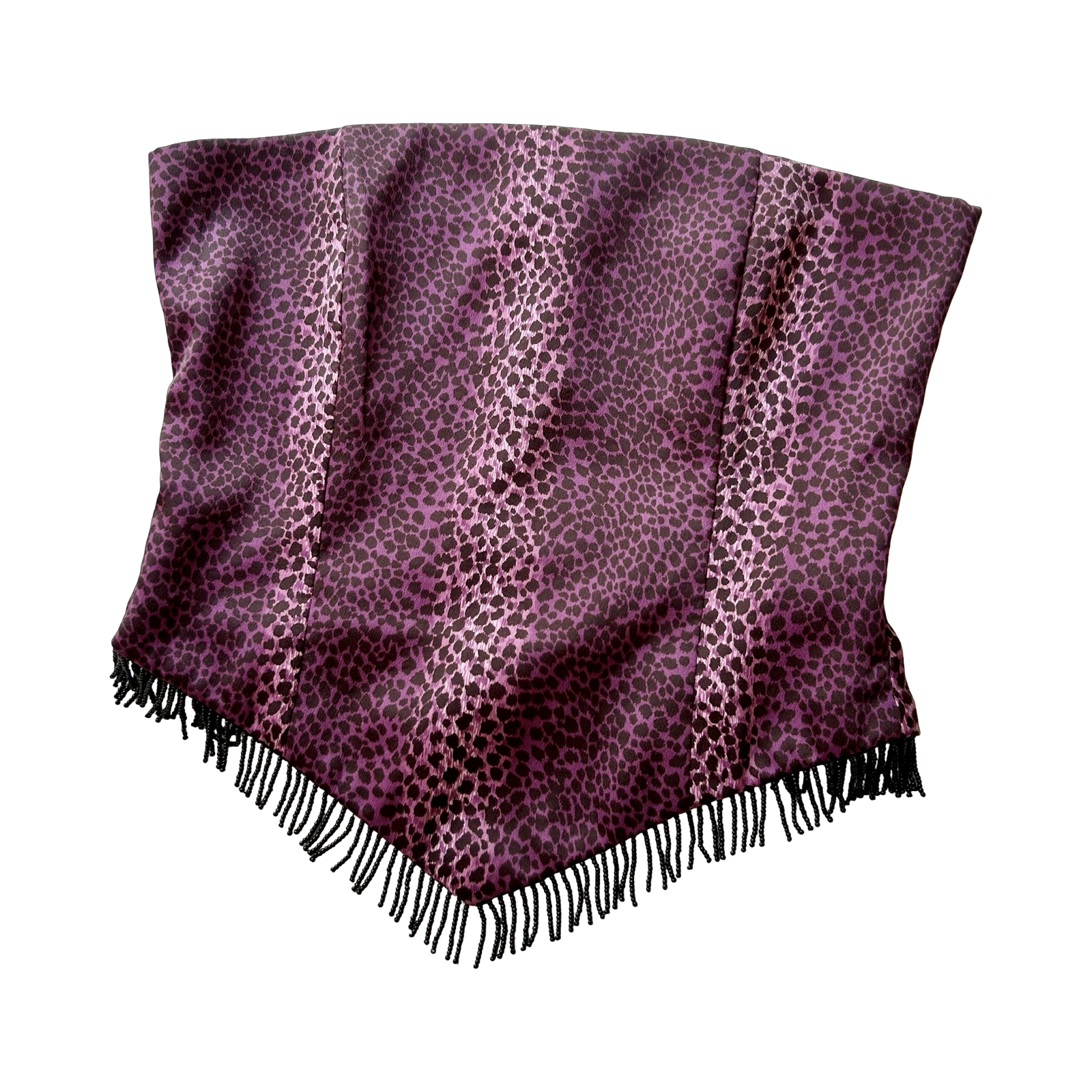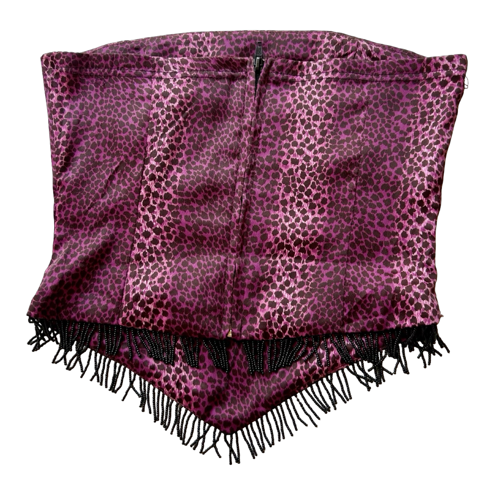 Strapless top made from satin-feel, purple leopard print fabric. Pointed hemline with black beaded fringe trim and back zipper closure.