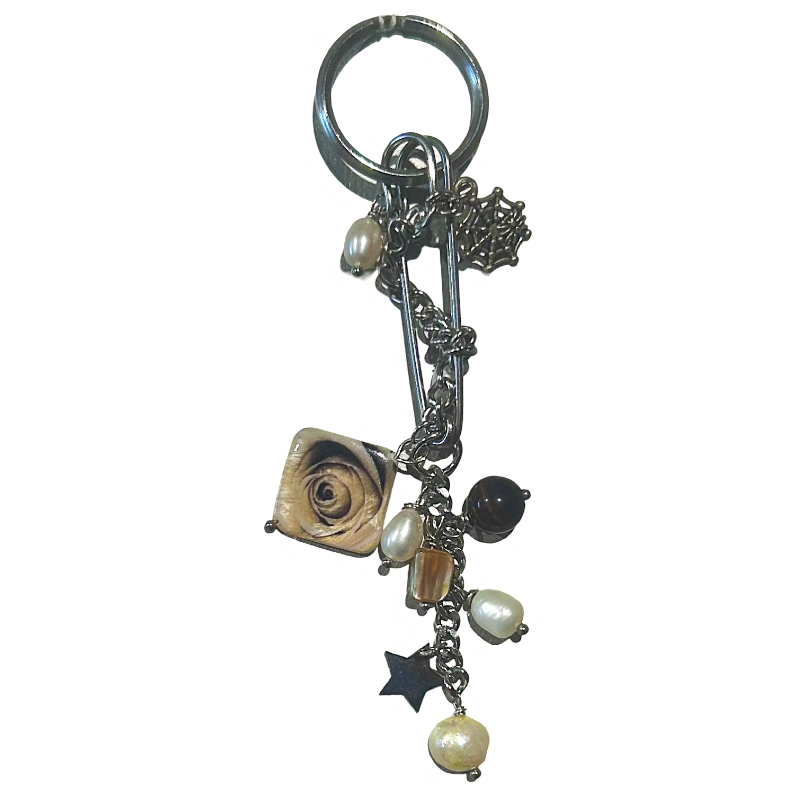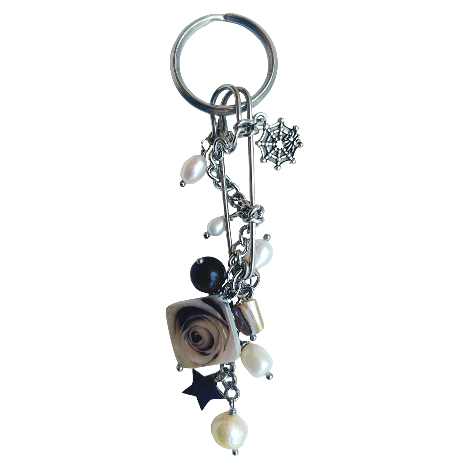freshwater pearls, shell, charms, and stainless steel chain on a safety pin