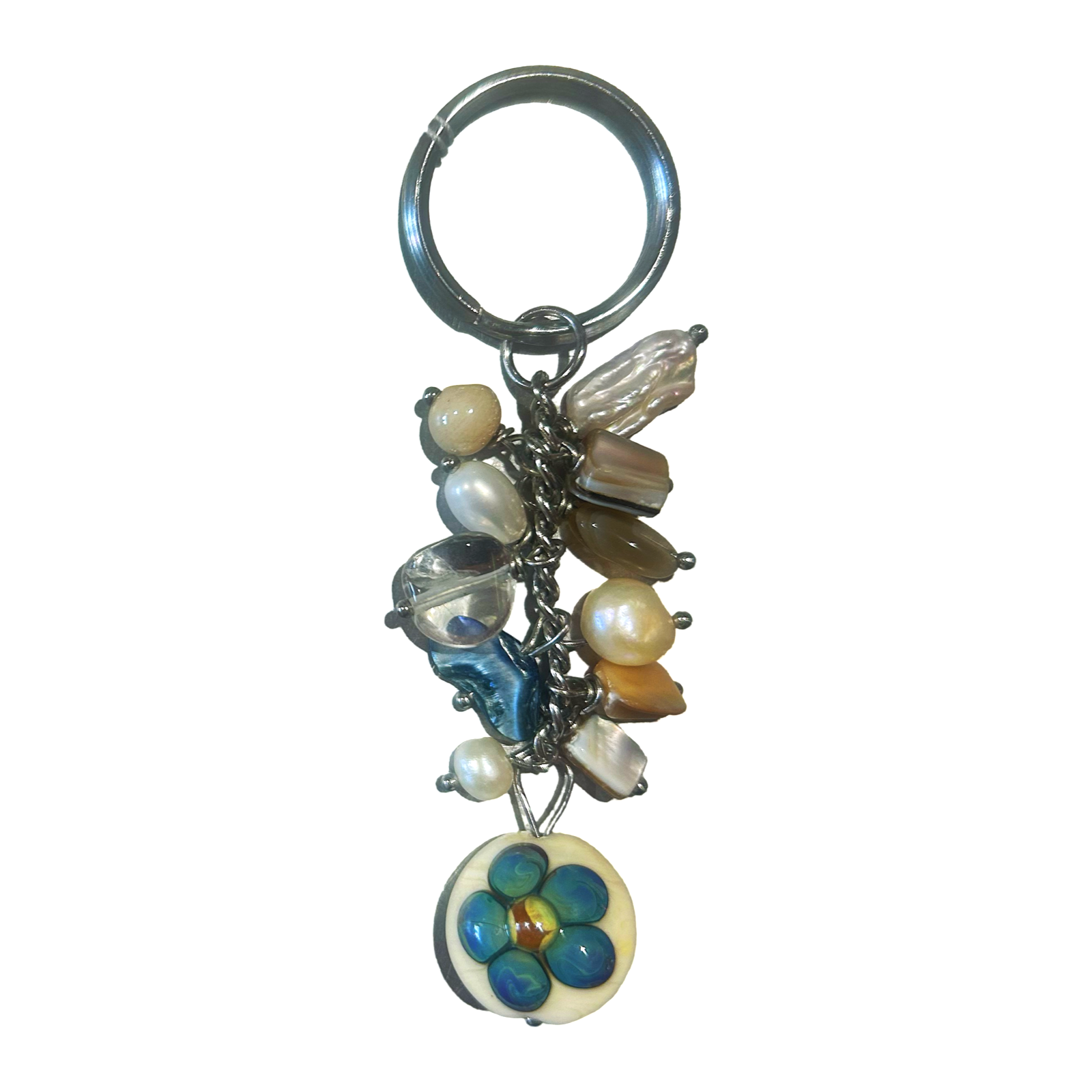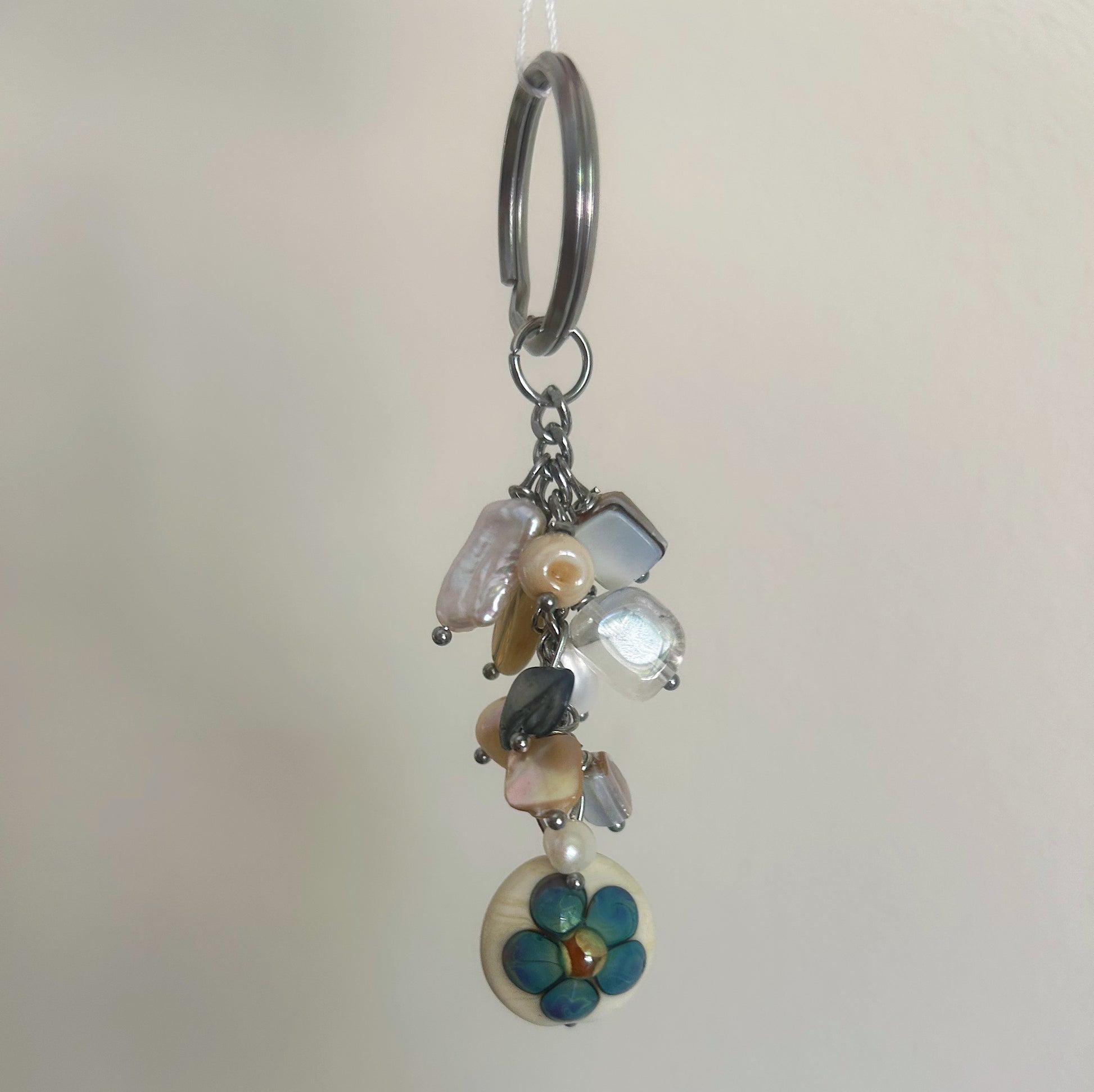 freshwater pearls and upcycled shells on a stainless steel chain, with a cute glass flower bead <3