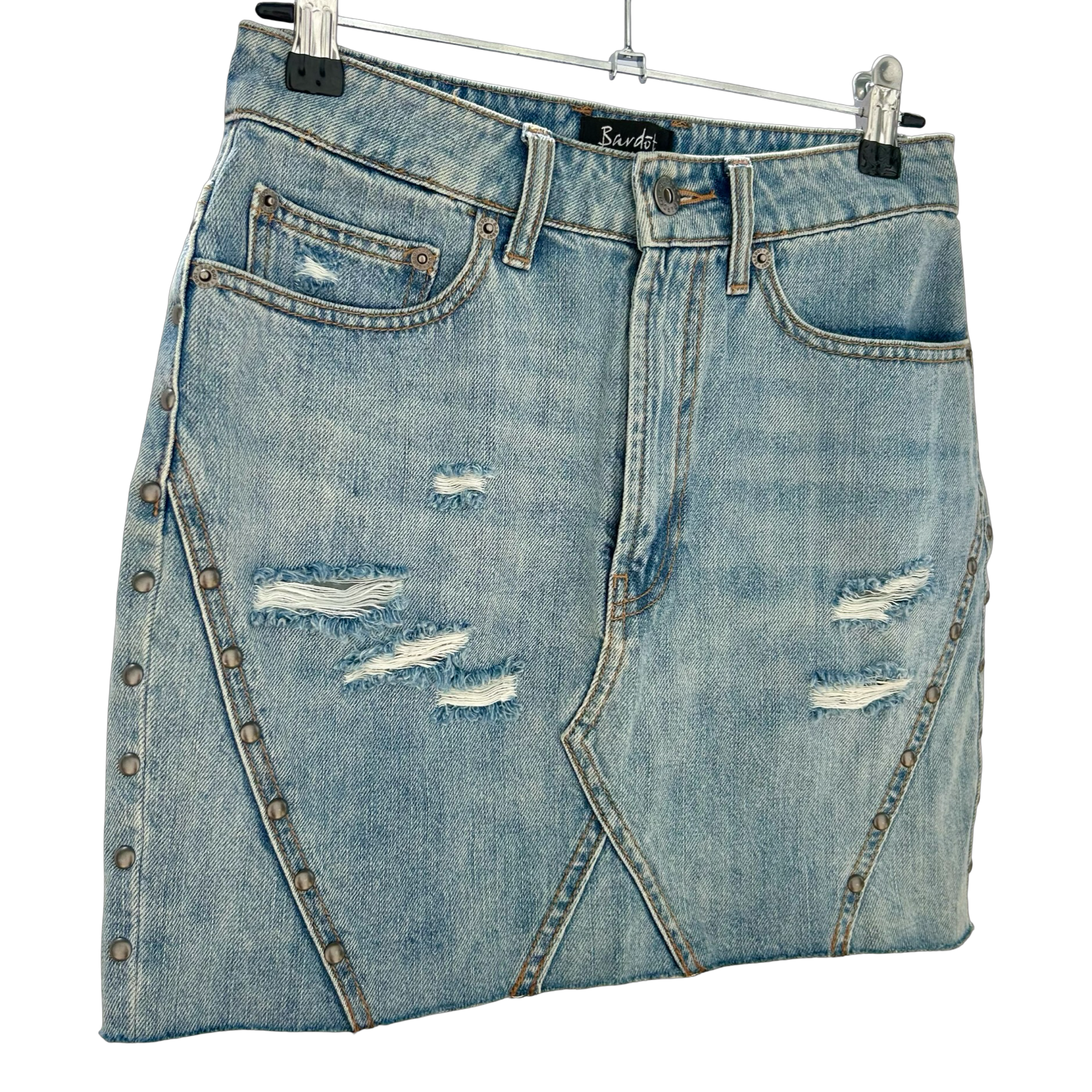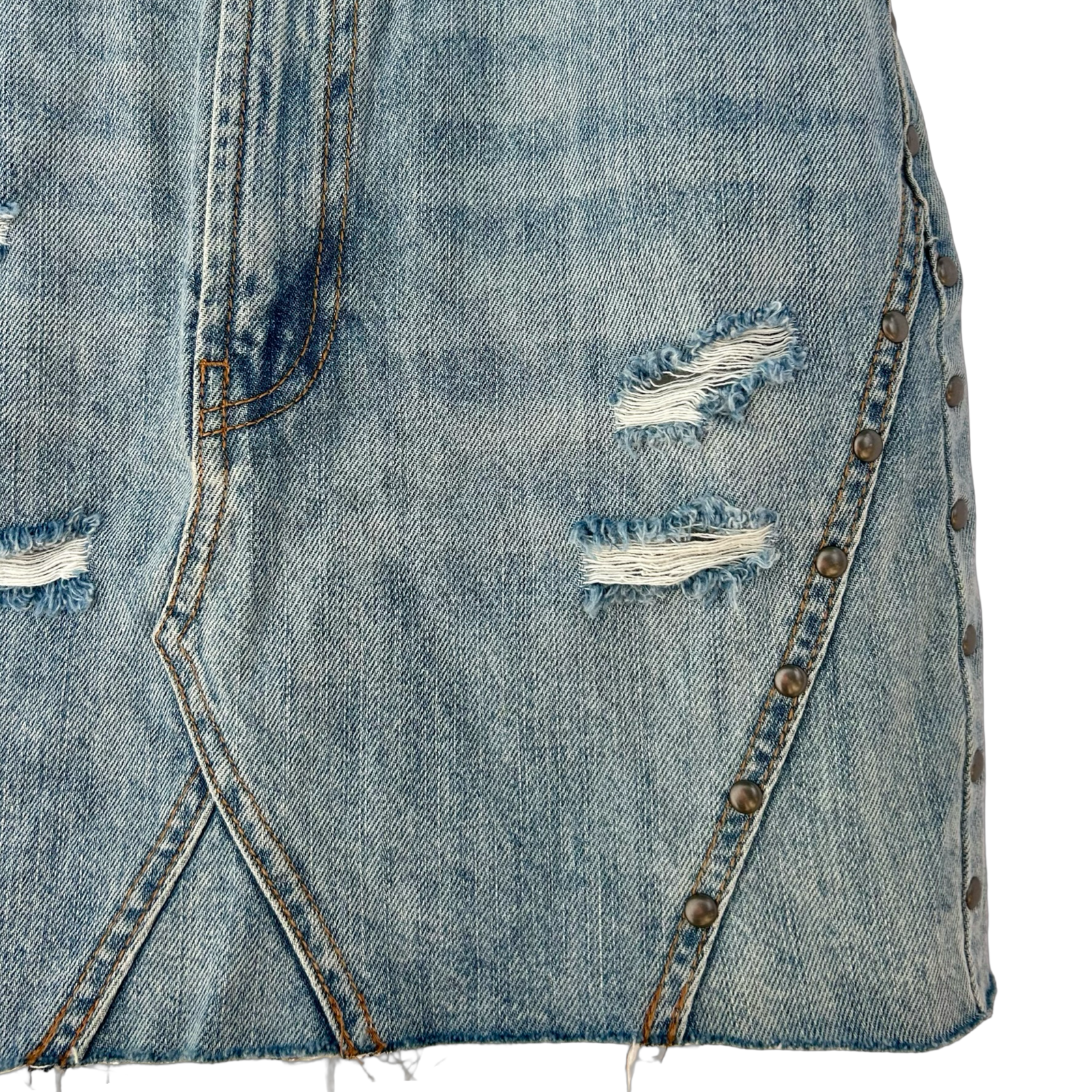 Blue denim mini skirt with distressing, studs and raw hem
