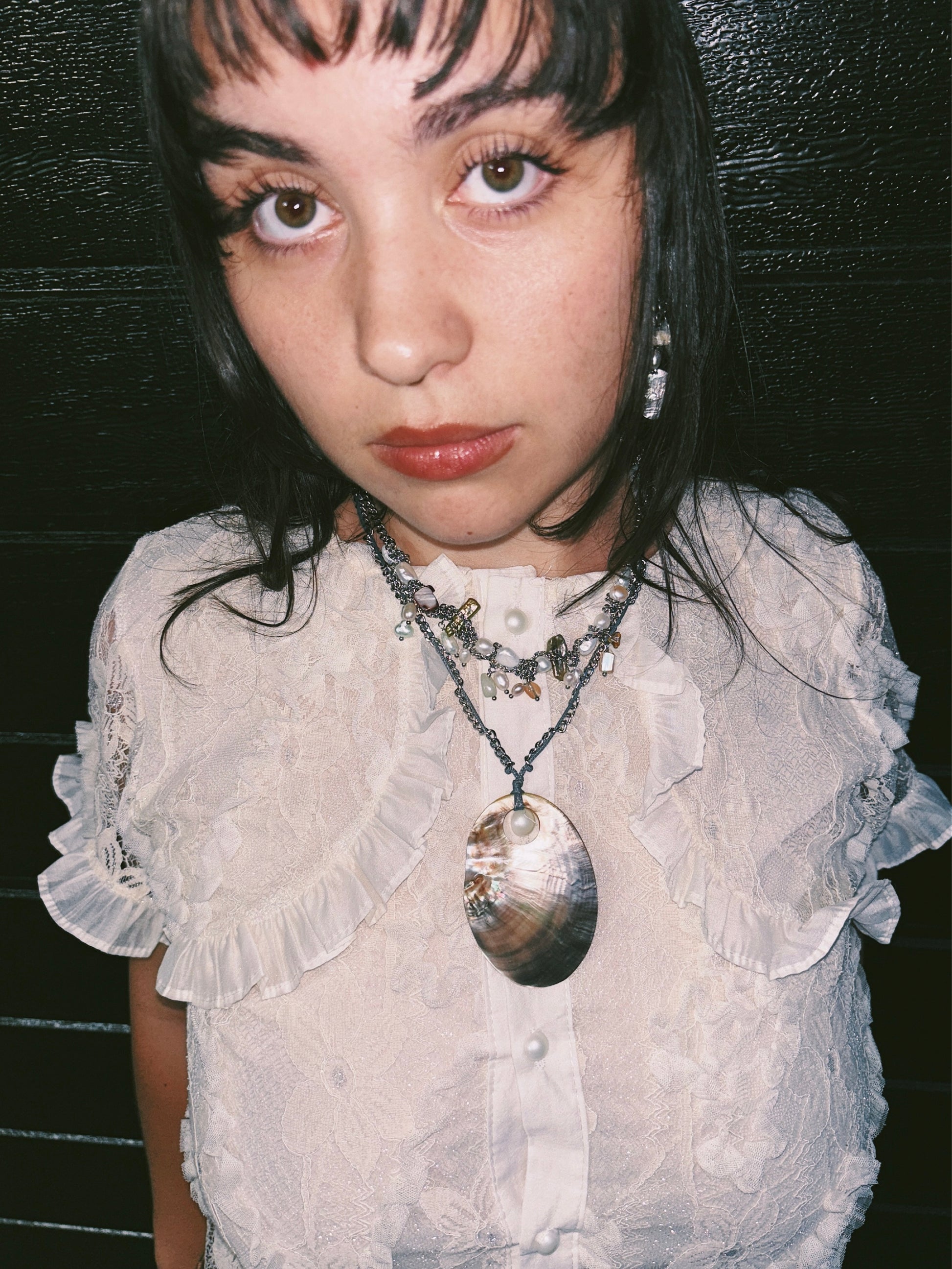 The most gorgeous button up cream blouse with floral lace and ruffles.