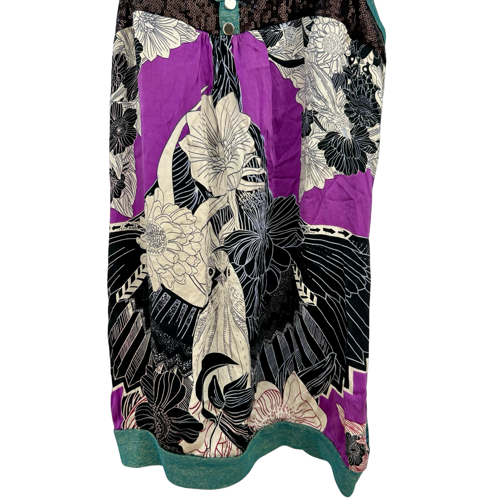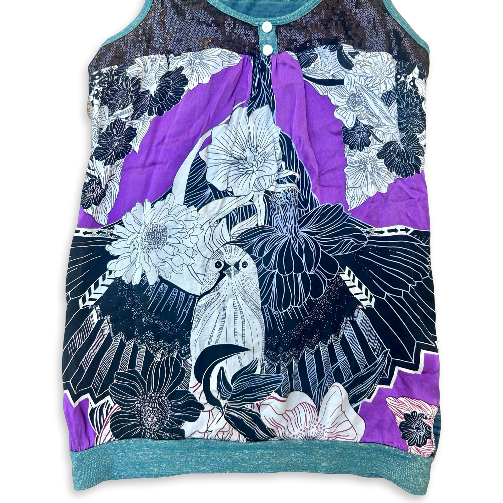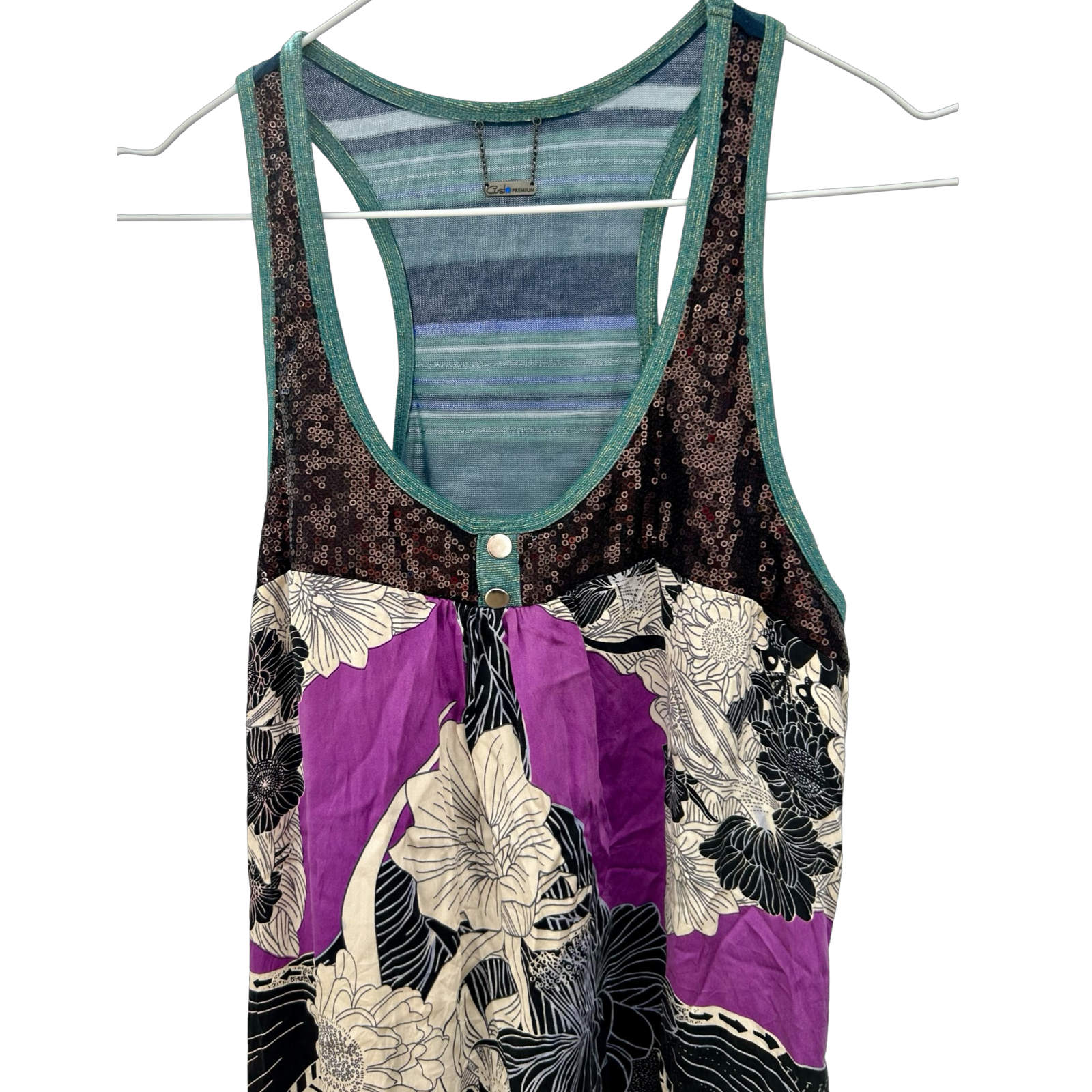 The most incredible Y2K tank top featuring black sequins; glittery, striped teal fabric; and floral art graphic printed on silk.