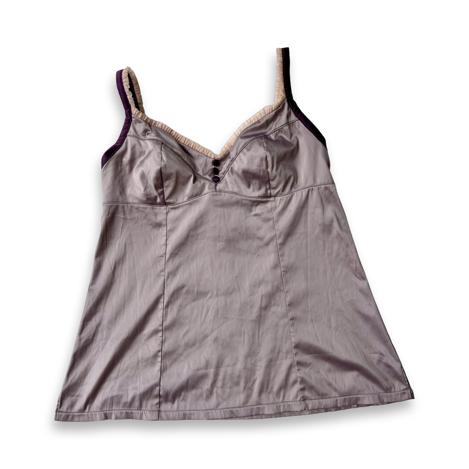 Lavender satin camisole with ruffle trim and adjustable straps.