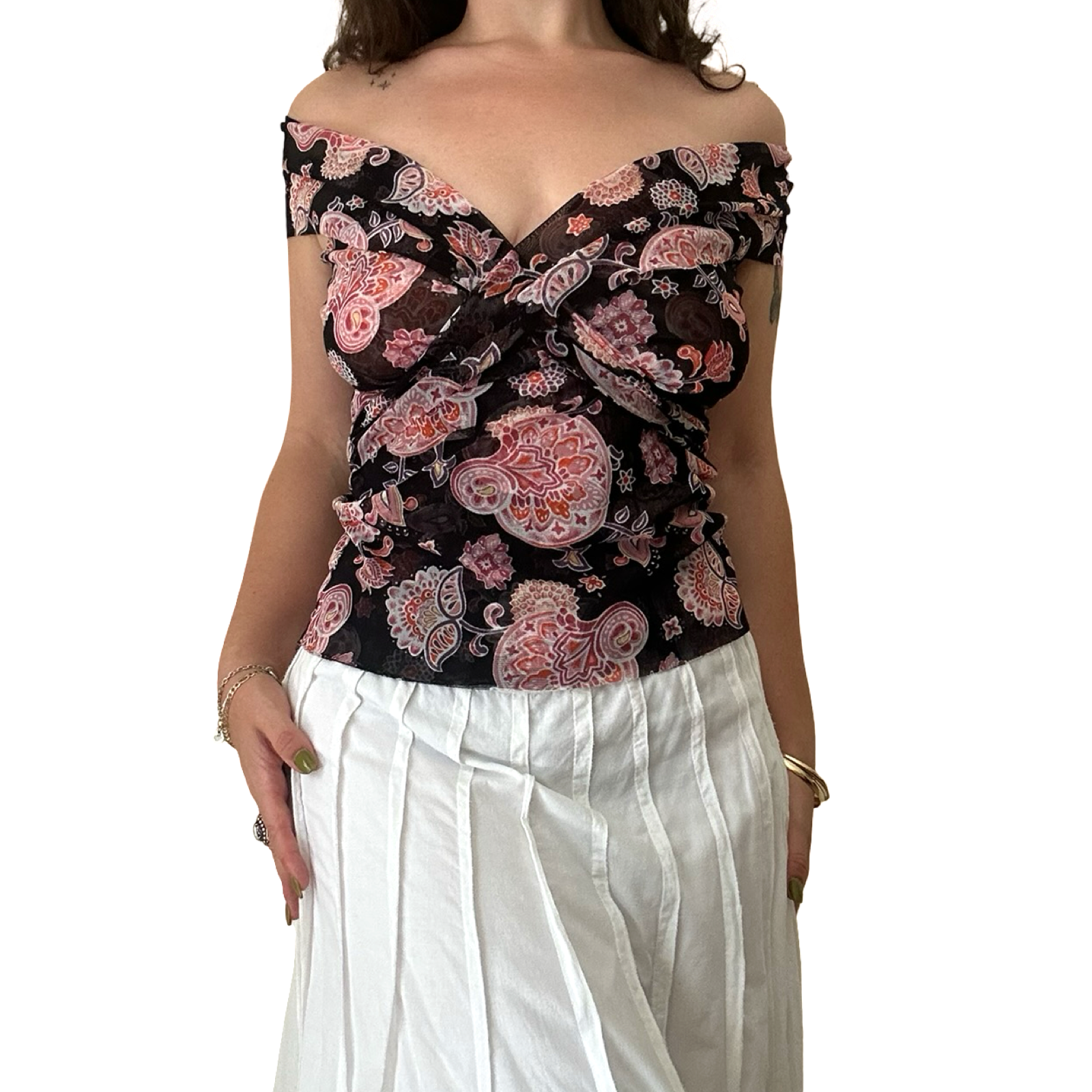 Black mesh top with an all-over pink paisley print. Twisted knot detail at the bust and cap sleeves (can be styled off the shoulder). Raw hem.