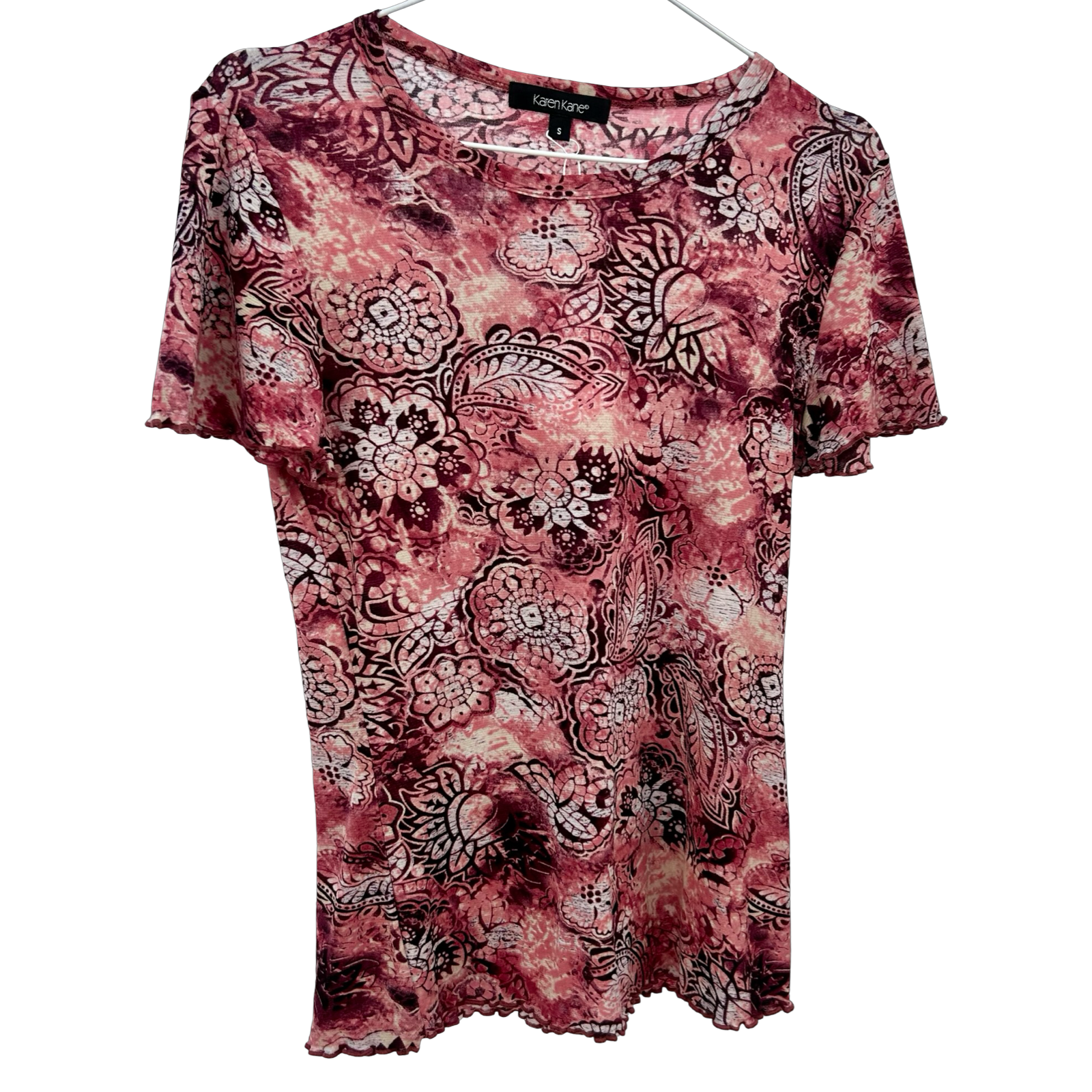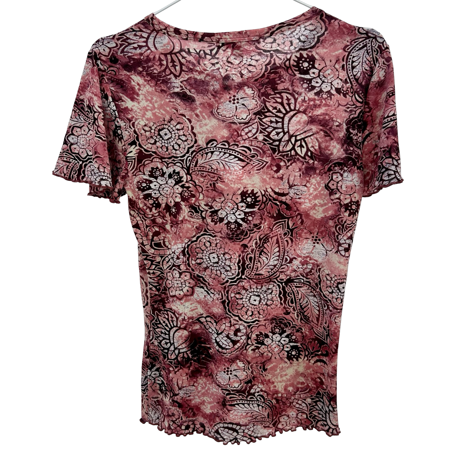 Vintage, Made-in-USA mesh tee in a pink/mauve paisley print with frilly lettuce hem.