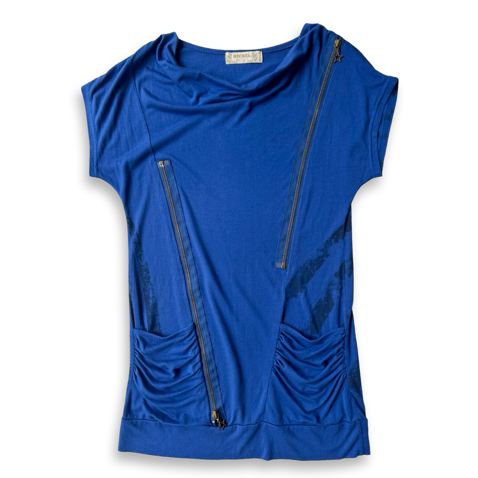 RARE Y2K Diesel electric blue longline top / two diagonal zip accents across the front / star zips / ruching at the sides with gathered pockets / relaxed, draped neckline / rockstar graphic on the back with diamantés