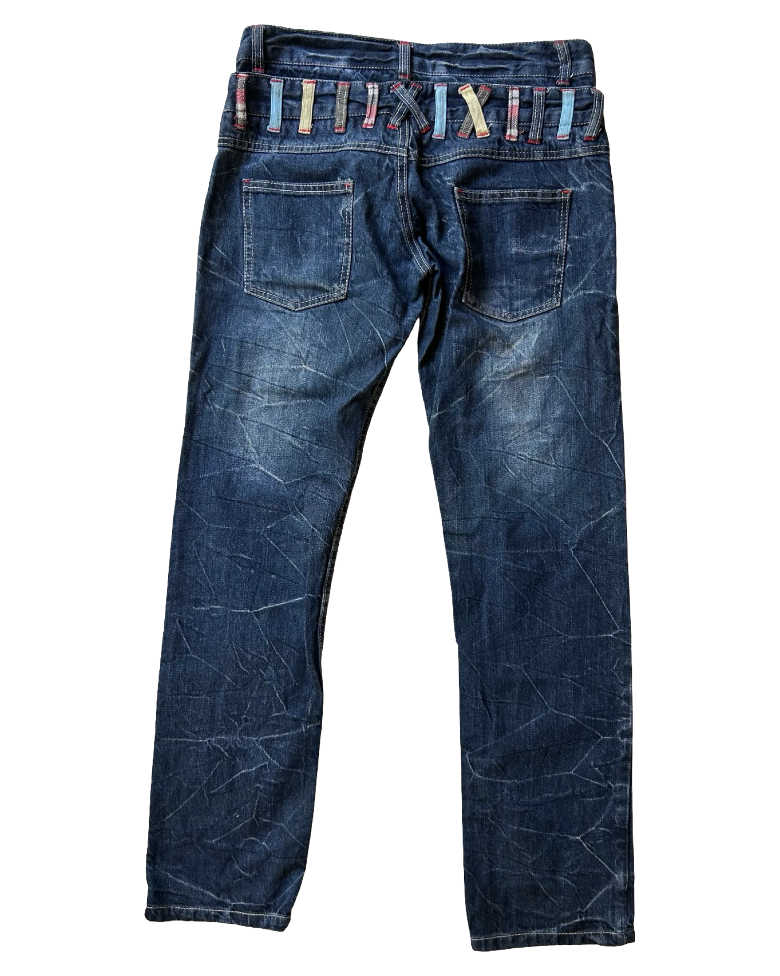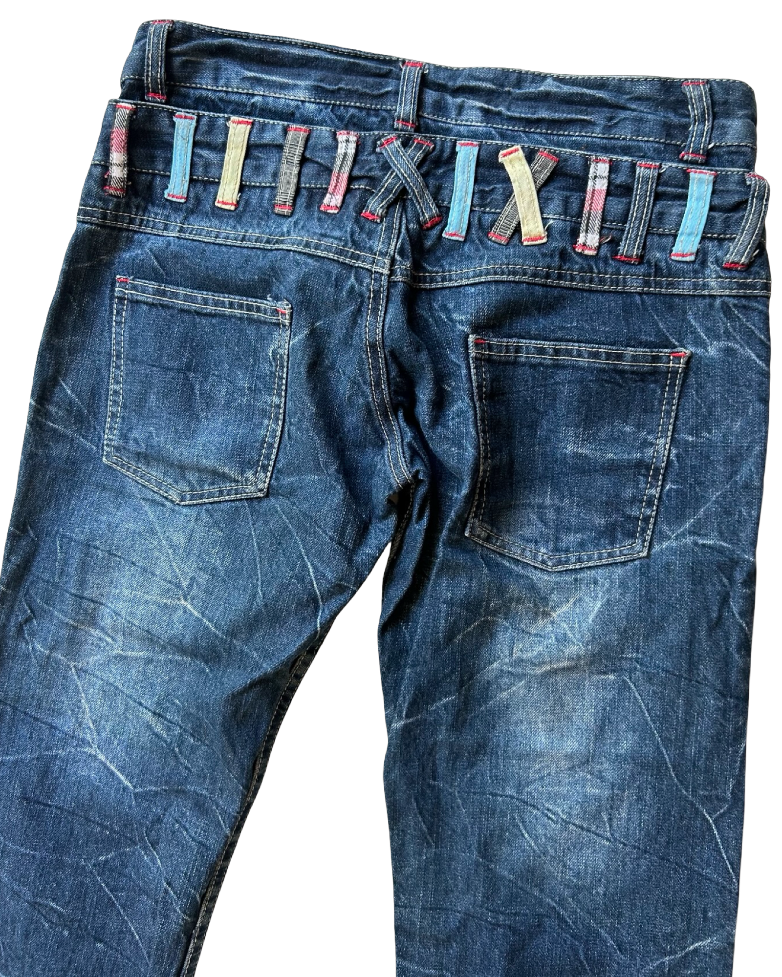 2000s punk dark wash jeans with a crinkled finish, double waistband, and colourful double belt loops