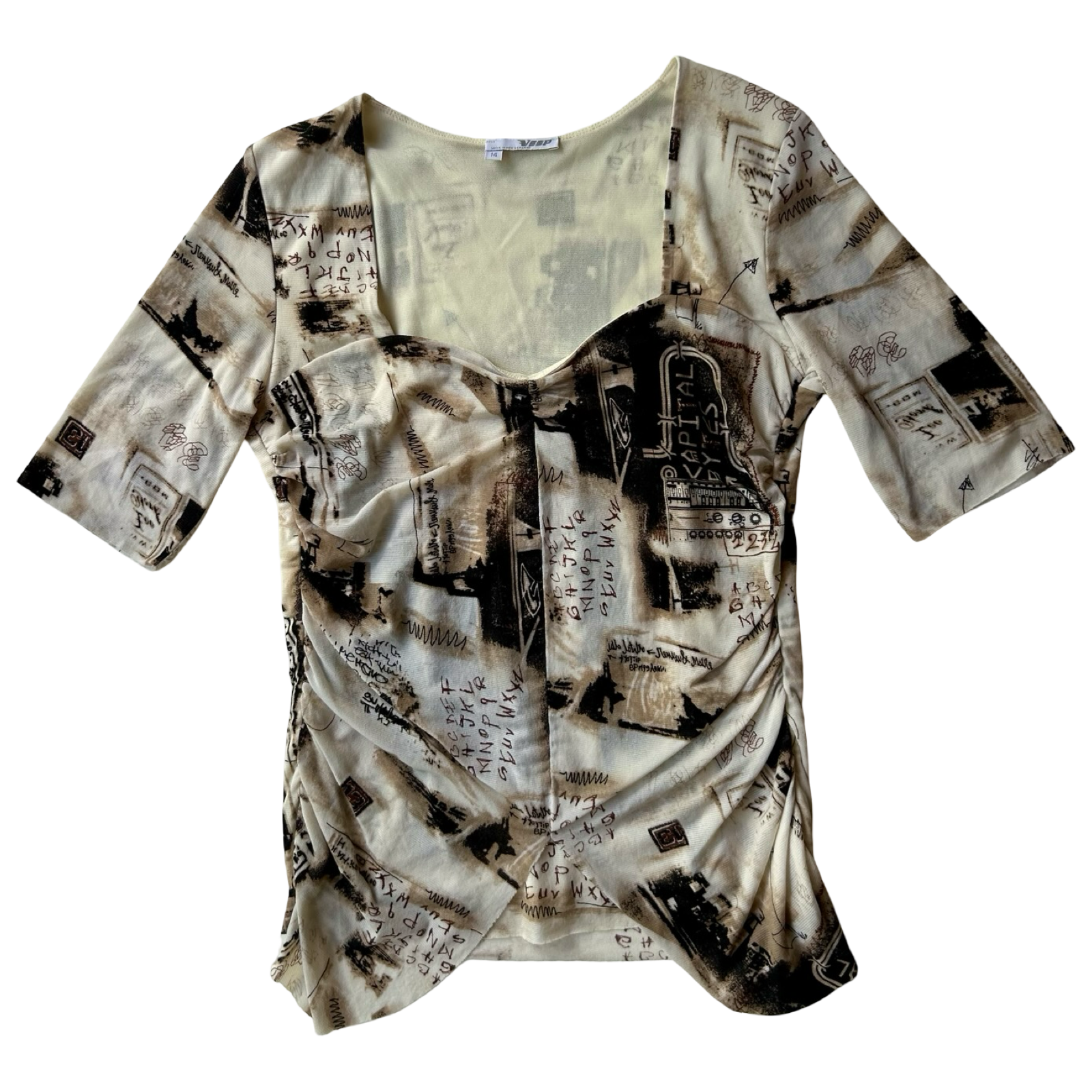 Mesh top with sepia graphic print, featuring a sweetheart neckline, ruched sides and mid-length sleeves.